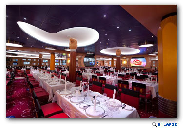 When first introduced, Disney brought many innovations to the cruise industry, but perhaps their most unusual was the rotational dining concept. In this, you have an assigned table each night, but you, your wait staff and your table mates rotate through different restaurants aboard the ship. This system continues on the Dream, and as she is doing some cruises as short as 3 nights, Disney kept to the 3 main dining rooms formula, after all every passenger would surely want a chance to eat in every restaurant so more were not needed.